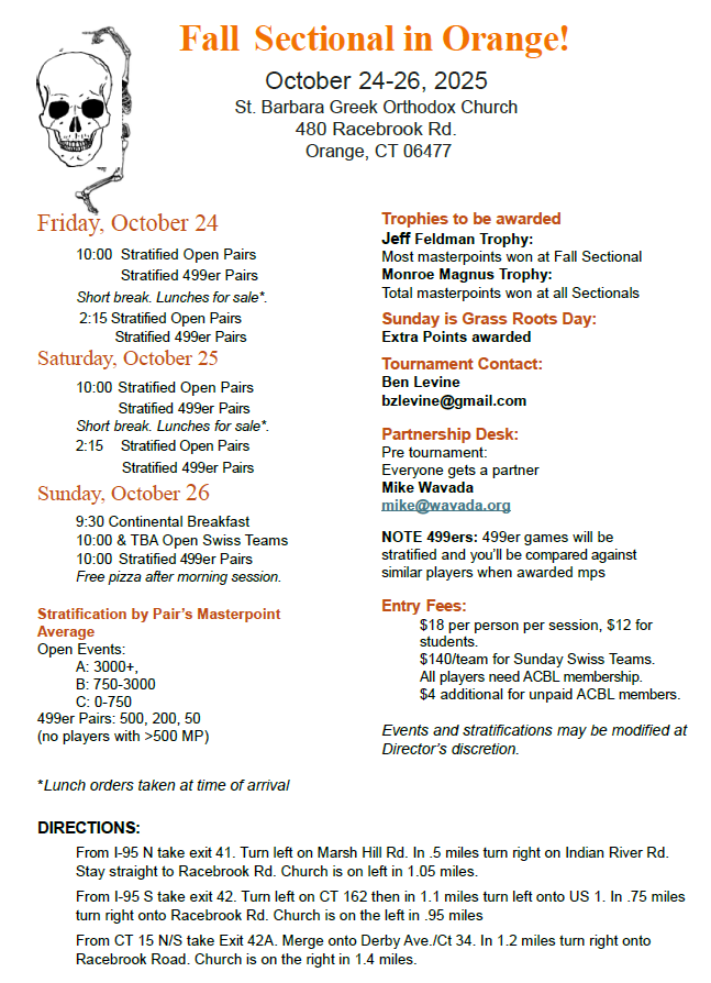 Our final Sectional tournament of the year is coming up quickly! We’ll be back at the St. Barbara Greek Orthodox Church in Orange next weekend and we hope to see you all there.