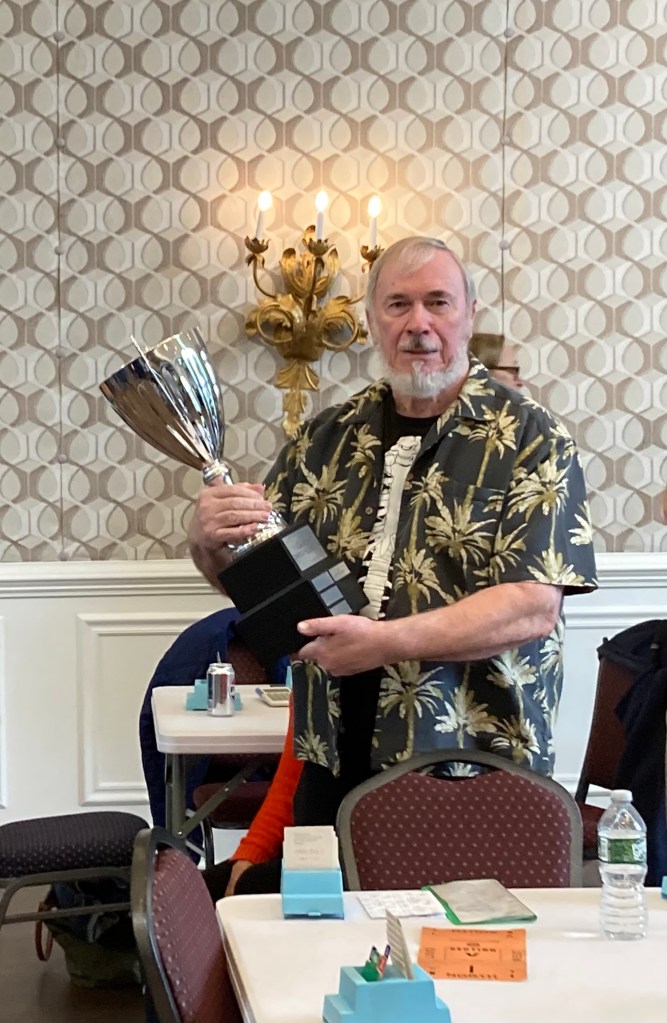 Frank Blachowski with the Governor’s Cup, which he earned at the August Sectional with nearly 25 masterpoints in three days. And he hasn’t slowed down, finishing first (with partner Tom Joyce) in this morning’s Open Pairs.